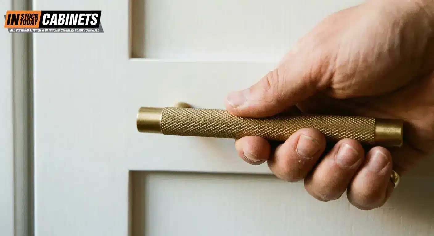 Unlacquered brass, knurled textures, sculptural oversized pulls, and sustainable artisan materials are the biggest 2026 shifts. Unlacquered brass develops a natural patina over time, aligning with the “living surface” movement. Knurled (cross-hatched) textures add tactile interest that contrasts against flat Shaker panels. Oversized pulls that span beyond the traditional rule of thirds are becoming acceptable for bold, architectural statements. Push-to-open handleless systems are gaining ground in high-traffic zones. Homes & Gardens’ trend report and Kitchen Tune-Up’s 2026 forecast cover these shifts in detail.