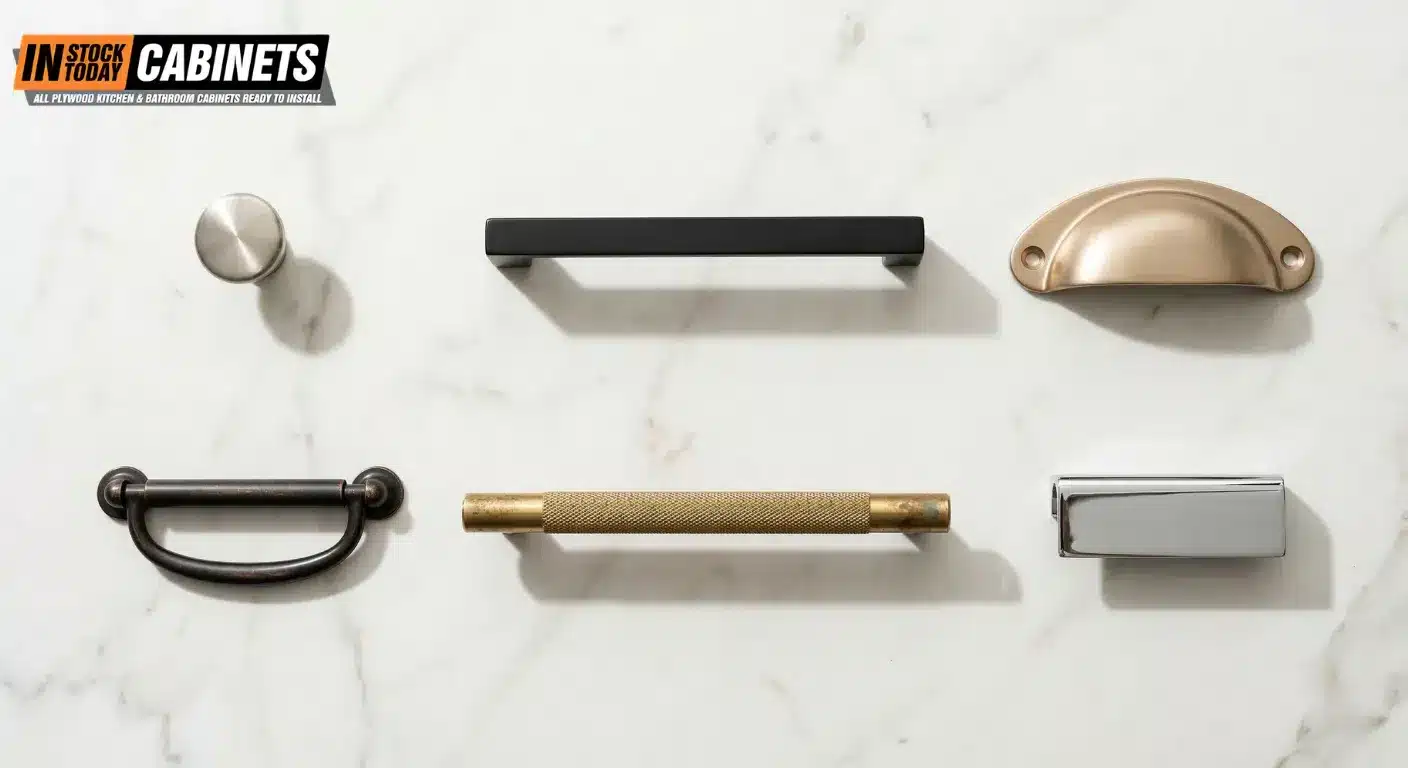 Match by temperature first. Warm cabinet tones (cream, wood, warm gray) pair with warm metals (brass, bronze, copper). Cool tones (white, navy, cool gray) pair with cool metals (nickel, chrome, stainless). After temperature, coordinate with your faucet and lighting fixtures using the 70/30 rule — 70% dominant metal, 30% secondary accent. Make sure the scale fits door proportions (rule of thirds for pulls, 1–2″ diameter for knobs). Order physical samples and test them under your actual kitchen lighting, because metal tones shift dramatically between showroom fluorescent and home LED.