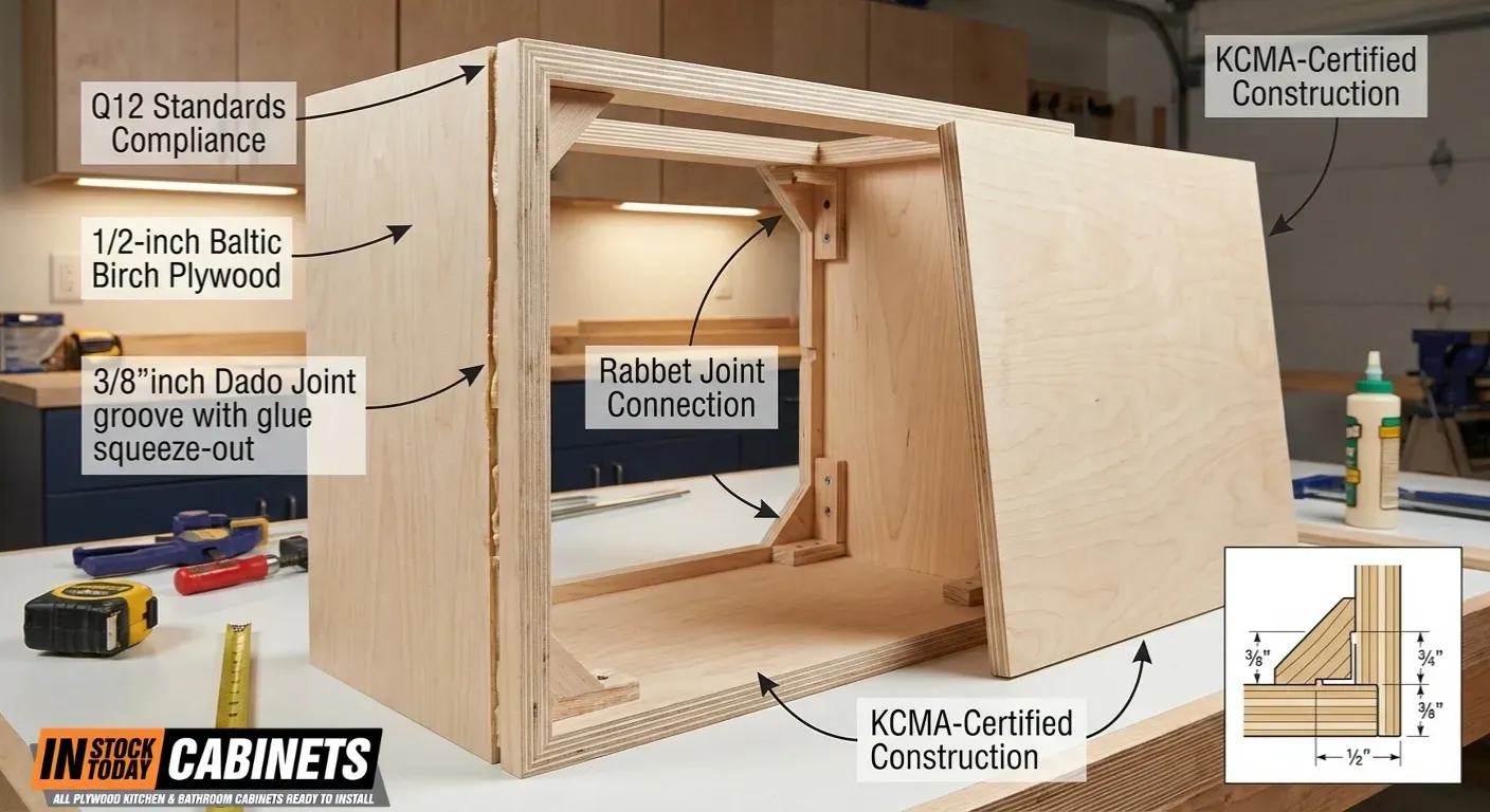 Follow AWI specifications aligned with project grade: Custom Grade (standard residential): 1/2″ sides minimum, 1/2″ backs, 3/4″ shelves and bottoms; Premium Grade (high-end residential/commercial): 3/4″ sides, 3/4″ backs, 3/4″ shelves and bottoms. Economy cabinets using 1/4″ backs and 1/2″ sides with particleboard represent substandard construction unsuitable for professional installations. Fabuwood exceeds Custom Grade baseline with 1/2″ sides and full 1/2″ one-piece backs (not stapled sections) as standard, with 3/4″ upgrades available. The performance difference is measurable: testing shows 1/2″ backs reduce racking (twisting) by approximately 40% versus 1/4″ alternatives, while 3/4″ sides improve screw-holding by 60% compared to 1/2″ material. For drawer boxes, specify 1/2″ minimum sides (5/8″ optimal) with 1/4″ to 3/8″ bottoms captured in dados rather than stapled. All plywood should meet CARB Phase 2 formaldehyde emissions standards.