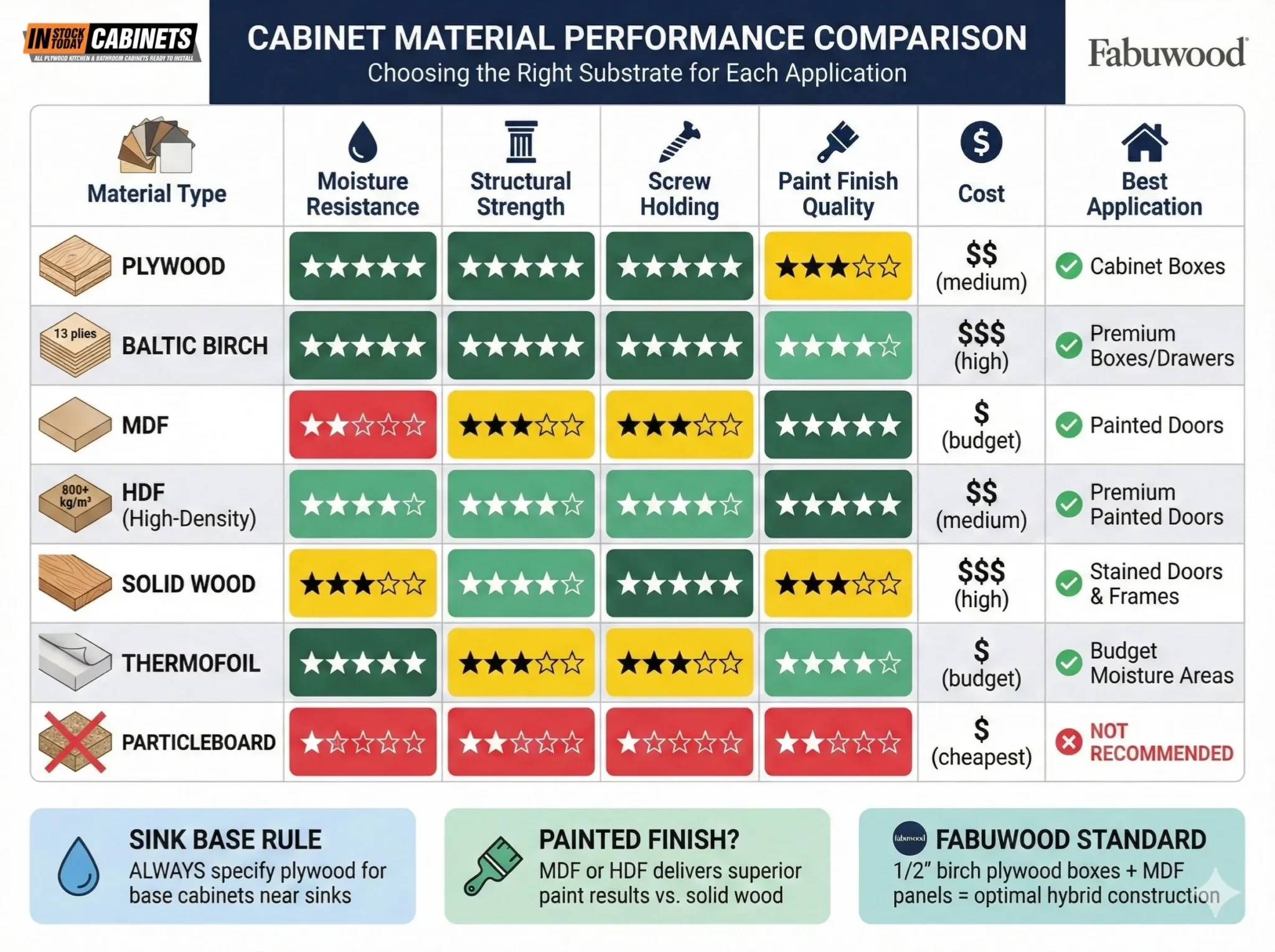 | Plywood | ★★★★★ | ★★★★★ | ★★★★★ | ★★★☆☆ | 1.5× | Cabinet boxes |