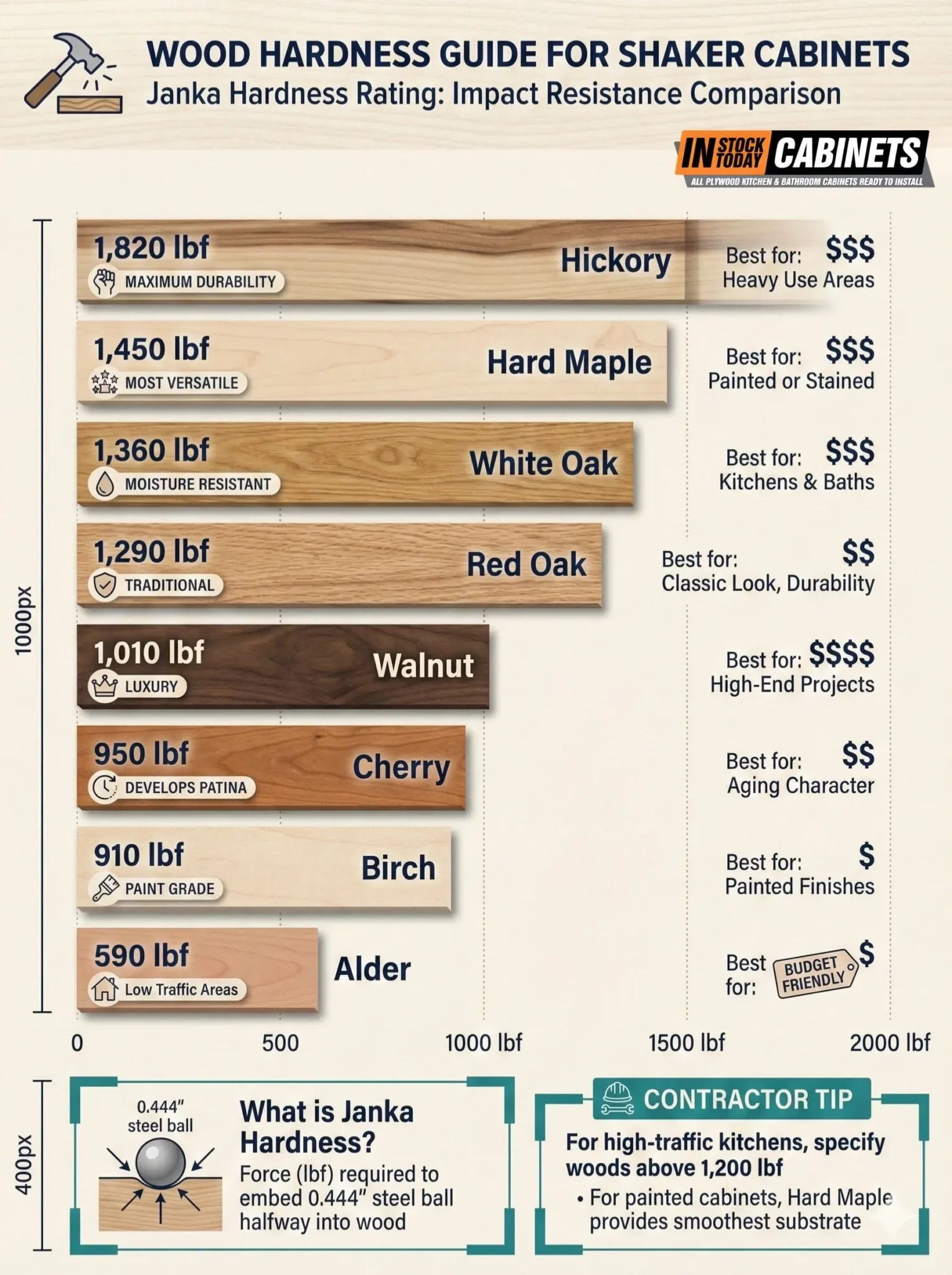 The Janka hardness scale measures wood’s resistance to denting and wear by measuring the force (in pounds) required to embed a 0.444-inch steel ball halfway into the wood. For Shaker cabinets serving busy kitchens, hardness directly correlates with long-term appearance retention.