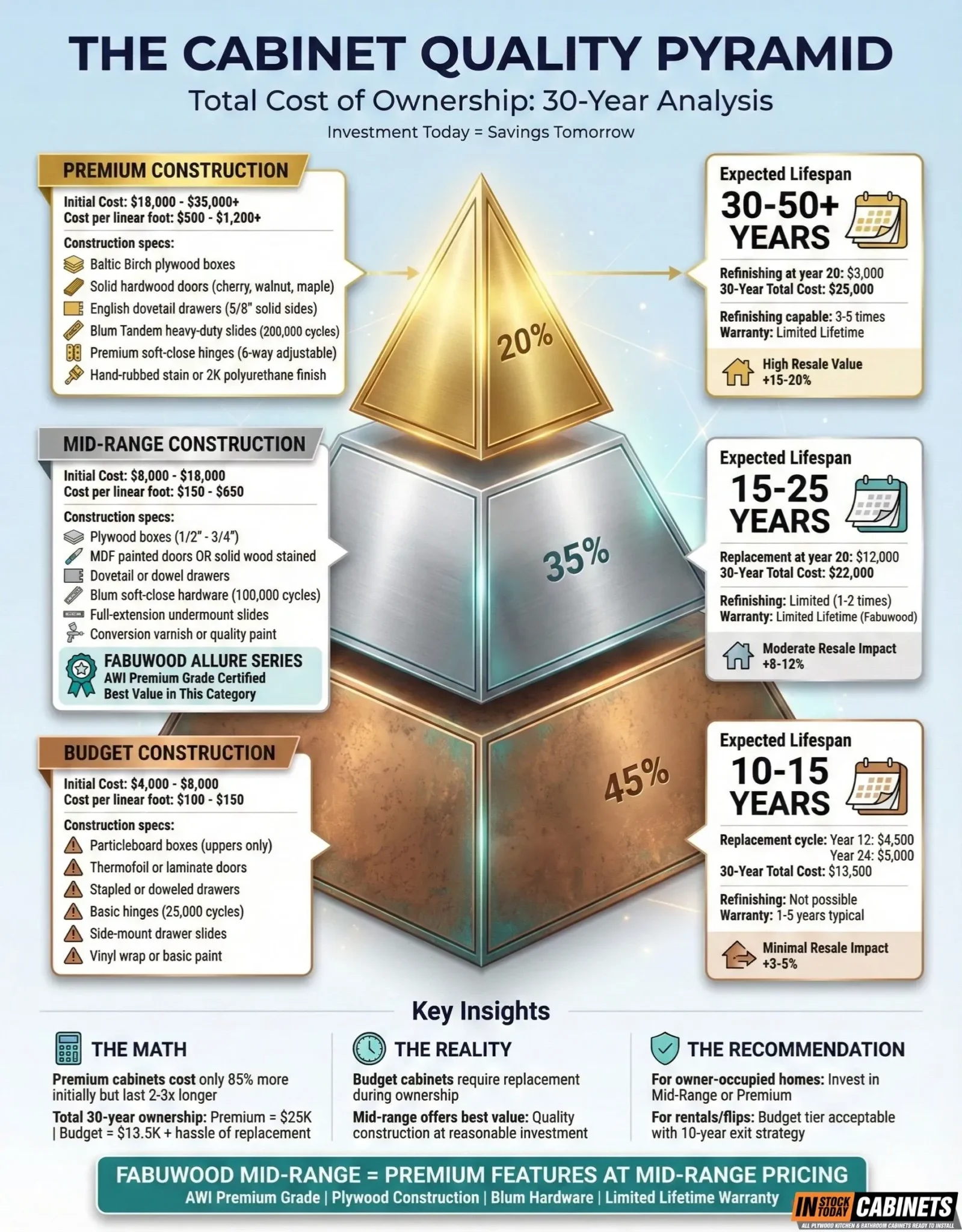 - Total cost of ownership favors premium materials over 30-year timeframes. Budget cabinets requiring replacement every 12 years accumulate higher costs than premium cabinets requiring only refinishing.