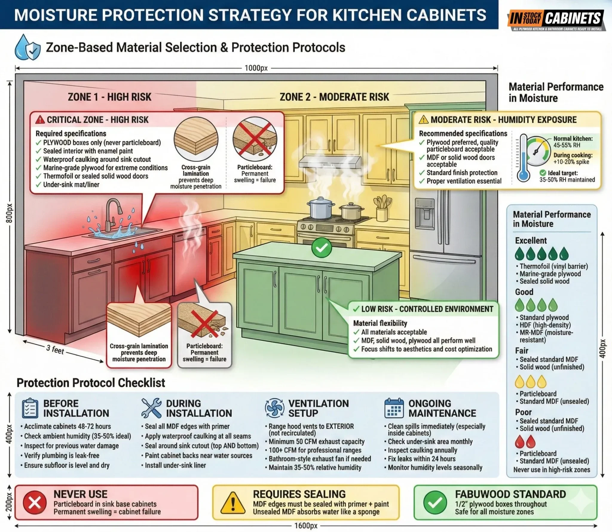 Moisture performance: Plywood withstands intermittent wetting without catastrophic swelling. Unlike particleboard, which swells permanently when wet, plywood maintains structural integrity even when damp—essential for sink bases and dishwasher surrounds.