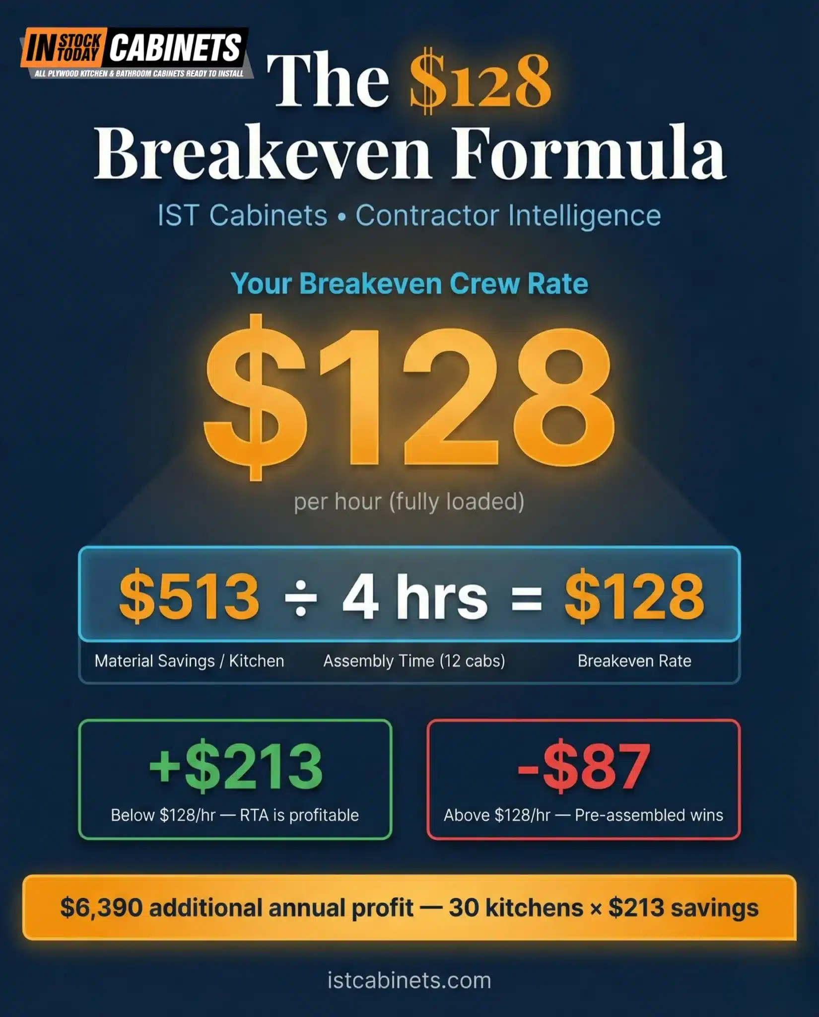| If your fully loaded crew rate is below $128/hour, RTA generates more profit per kitchen. Above $128/hour, pre-assembled is the better financial decision. |