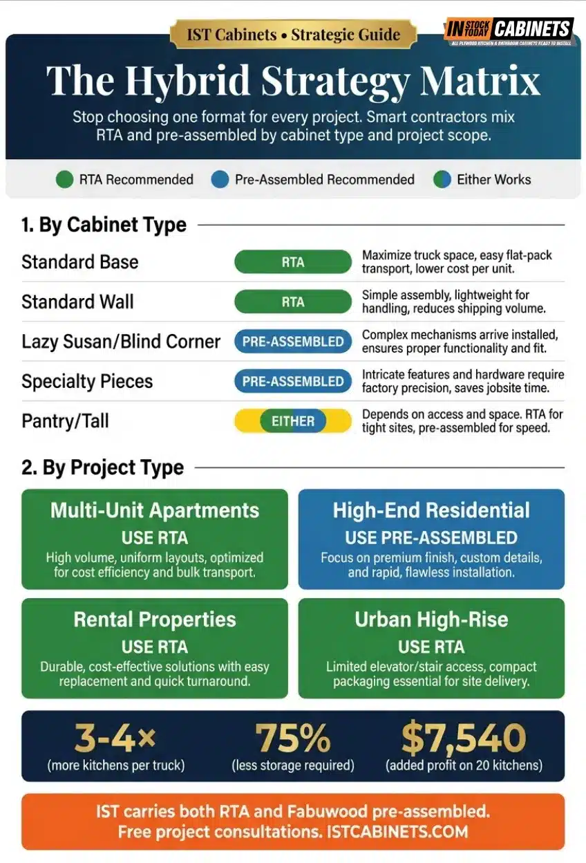 Mix Formats, Don’t Pick Sides: Use RTA for standard base and wall cabinets. Use pre-assembled for lazy susans, blind corners, and specialty pieces where factory QC prevents costly assembly errors.