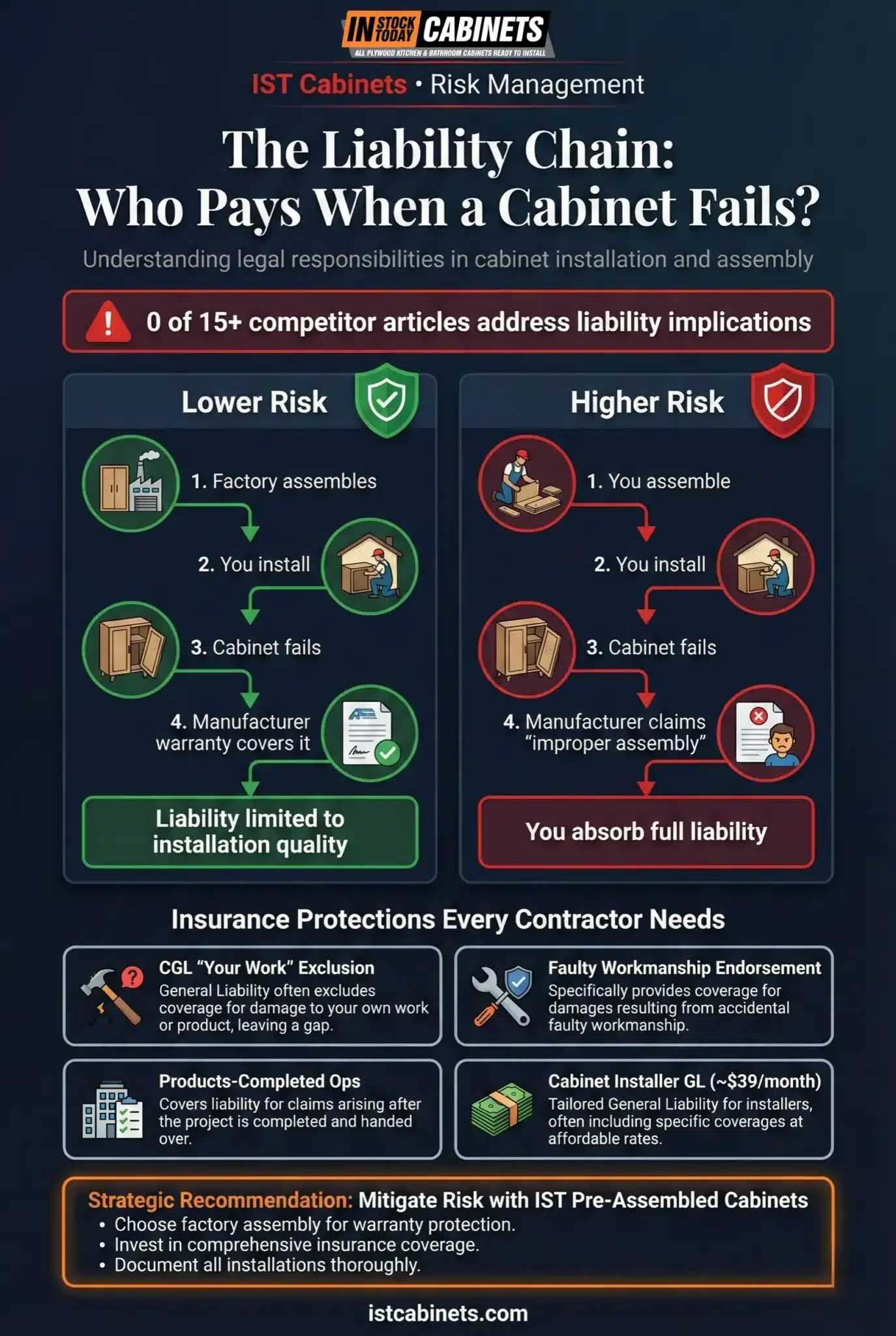 If you read only one section of this article, make it this one. Not one competing blog post—out of the 15+ we analyzed—addresses liability and insurance implications of RTA vs. pre-assembled cabinet installation. That silence should concern you.